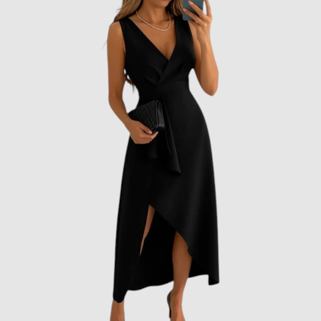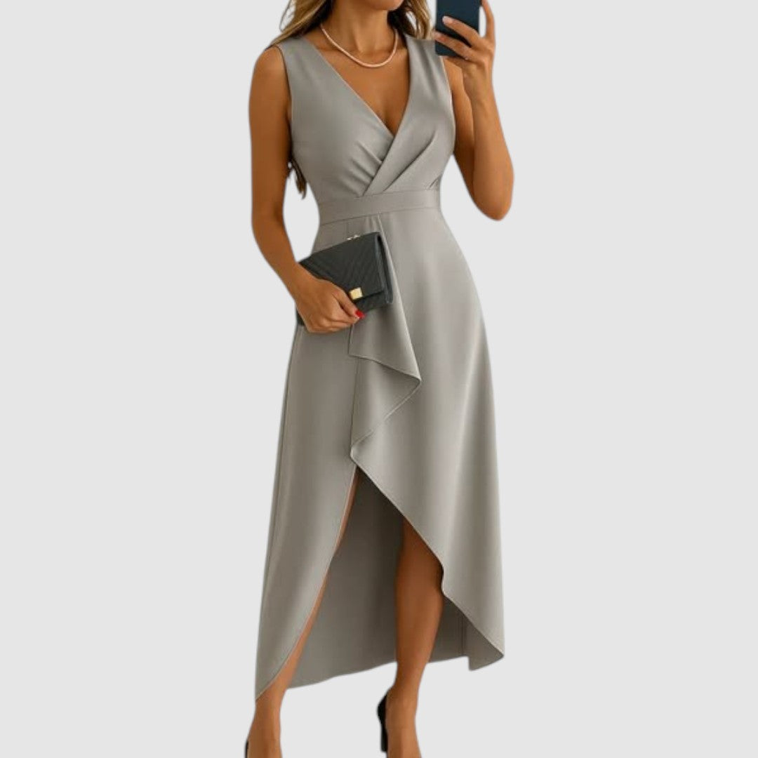 Okouzlující šaty s moderním asymetrickým střihem, které podtrhují ženskou siluetu a dodávají outfitu nádech sofistikovanosti. Hlubší výstřih a decentní volán v přední části působí žensky a elegantně. Perfektní volba pro svatby, večírky nebo jiné slavnostní události.