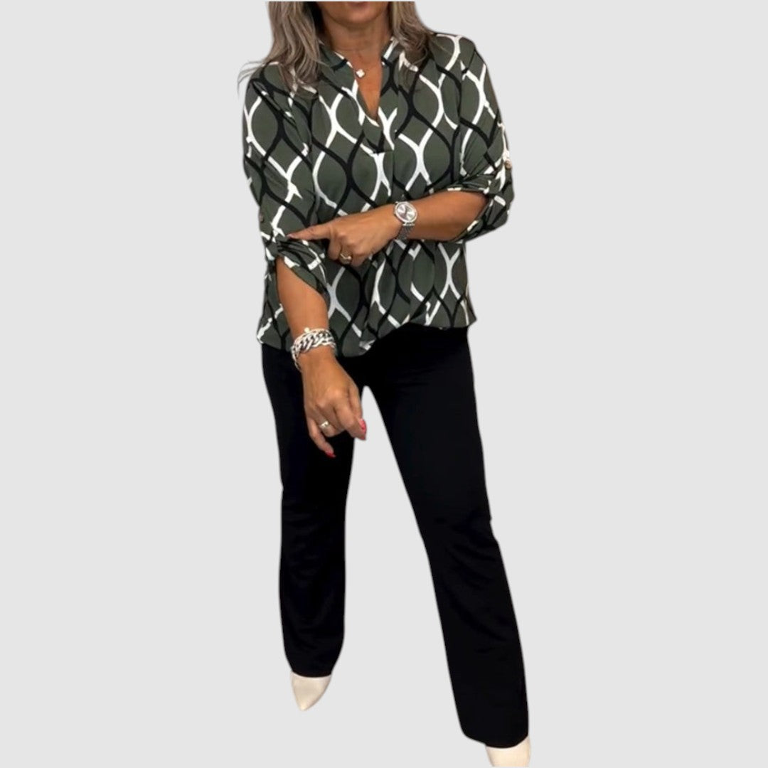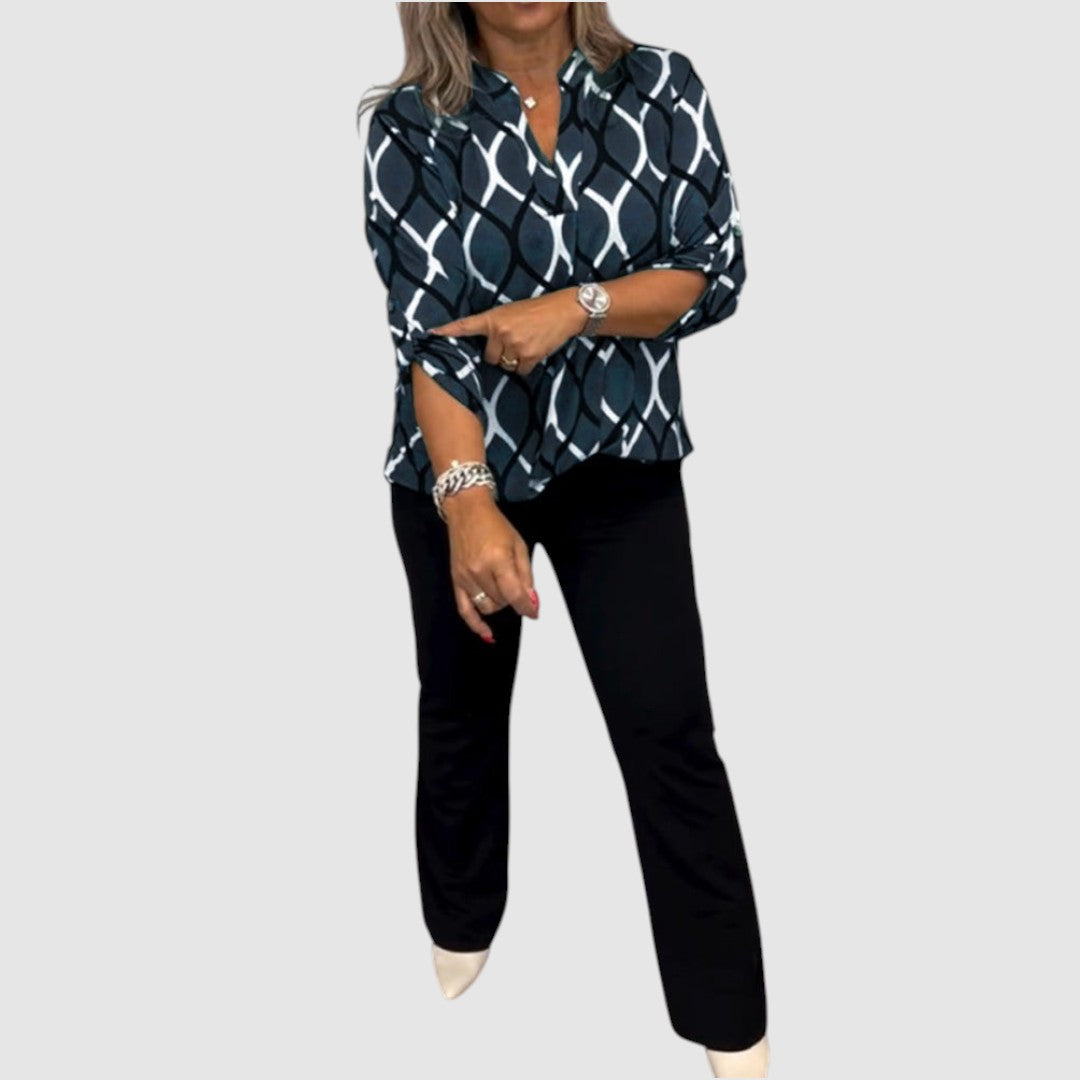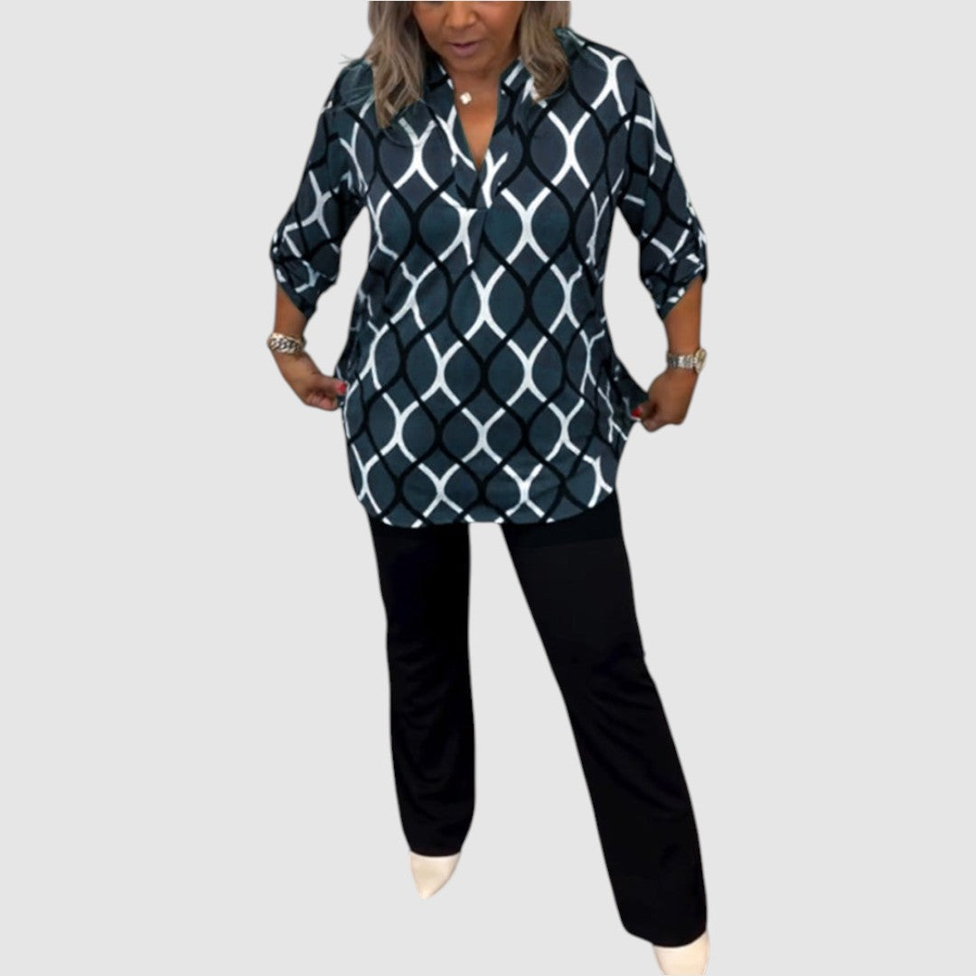 Stylová blůza, která vyniká originálním geometrickým designem a pohodlným střihem. Díky lehkému materiálu je ideální pro celodenní nošení, ať už do práce, do města nebo na volný čas. Výstřih do V a 3/4 rukávy dodávají elegantní a současně ležérní vzhled.