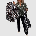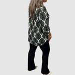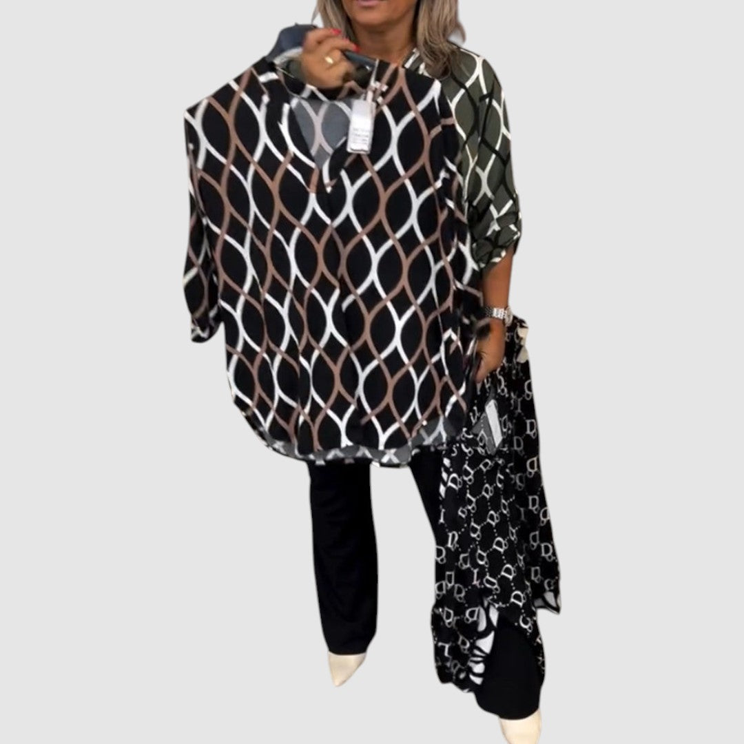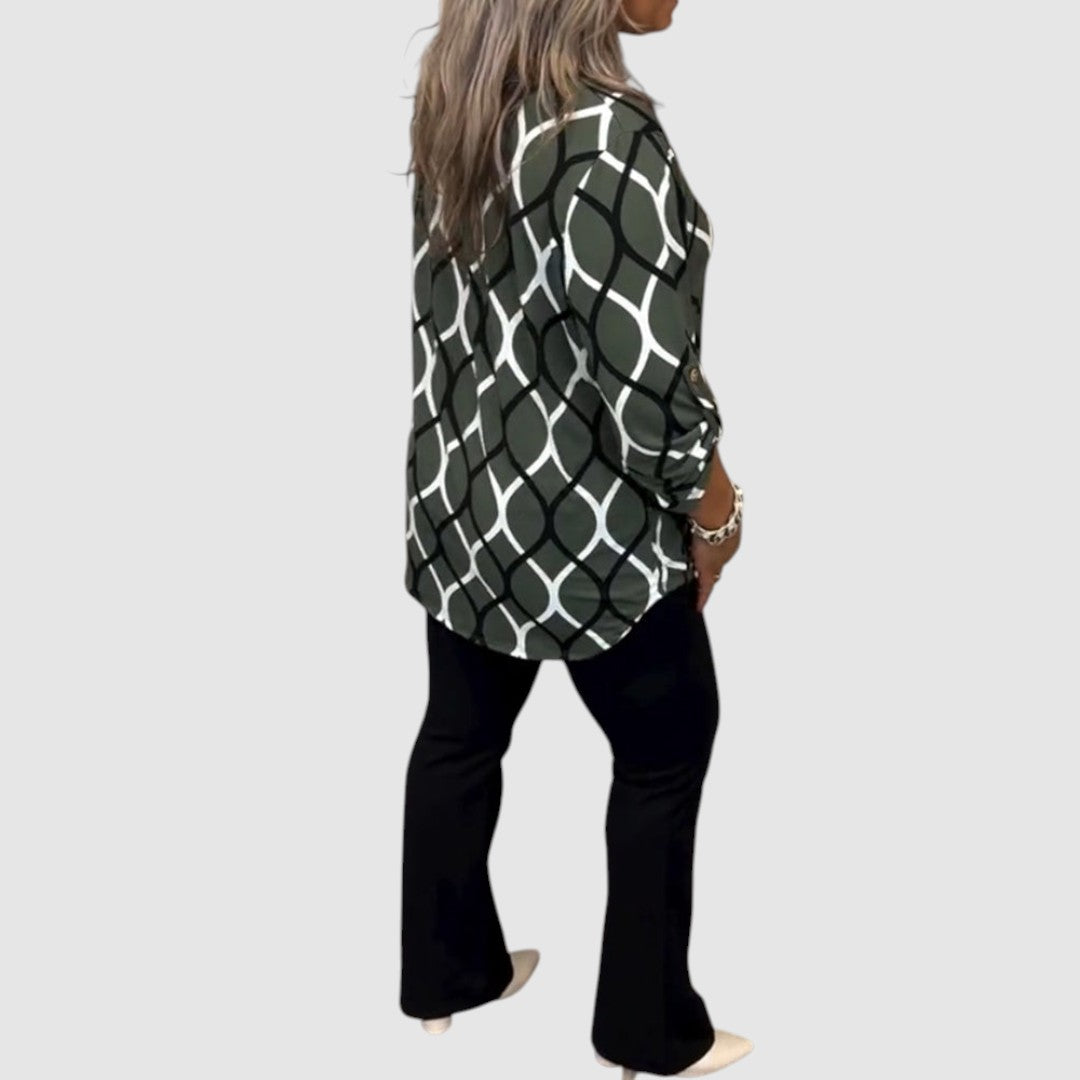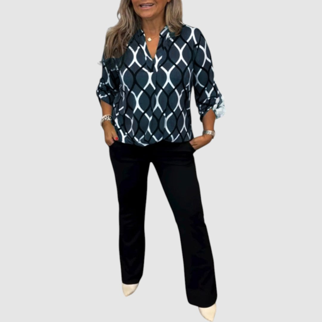 Stylová blůza, která vyniká originálním geometrickým designem a pohodlným střihem. Díky lehkému materiálu je ideální pro celodenní nošení, ať už do práce, do města nebo na volný čas. Výstřih do V a 3/4 rukávy dodávají elegantní a současně ležérní vzhled.