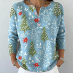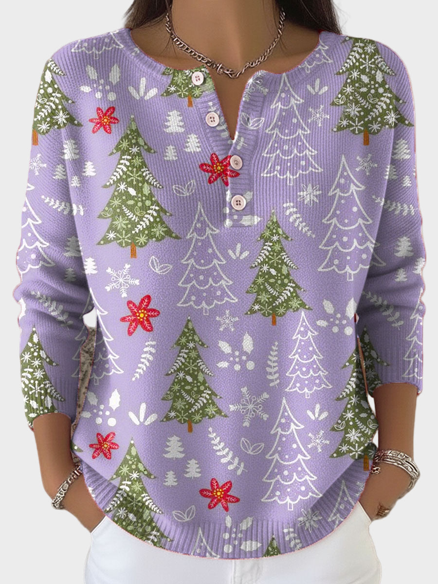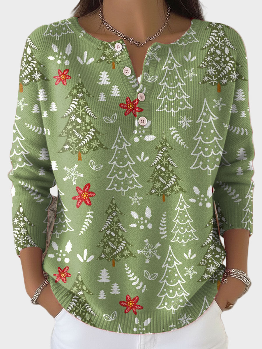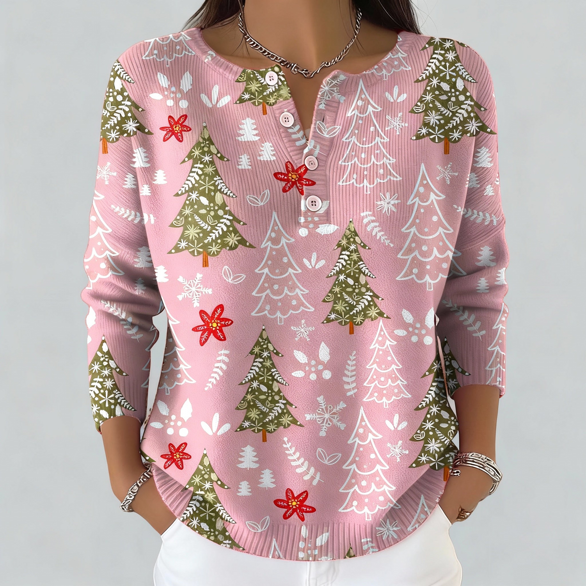 Nabízí nadčasový sváteční vzhled s atmosférickým vzorem a měkkou pleteninou, která zpříjemní zimní dny. Jemné zapínání u krku dodává ženský dotek.Tento svetr je ideální pro uvolněné vánoční chvíle i útulná setkání. Teplá pletenina a motivy borových větví, sněhových vloček a červených květin vytvářejí harmonický vzhled, po kterém rádi sáhnete znovu.