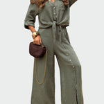 Dámský **celkový overal** v khaki odstínu s elegantním a pohodlným designem, který vyzařuje nenucenou eleganci. Disponuje **knoflíky v horní části**, páskem, který se váže v pase pro ženskou siluetu, a **širokými kalhotami s knoflíky na boku**, které nabízejí pohyb a styl. Ideální pro každodenní nošení, ale i pro večerní výlety s vhodnými doplňky.